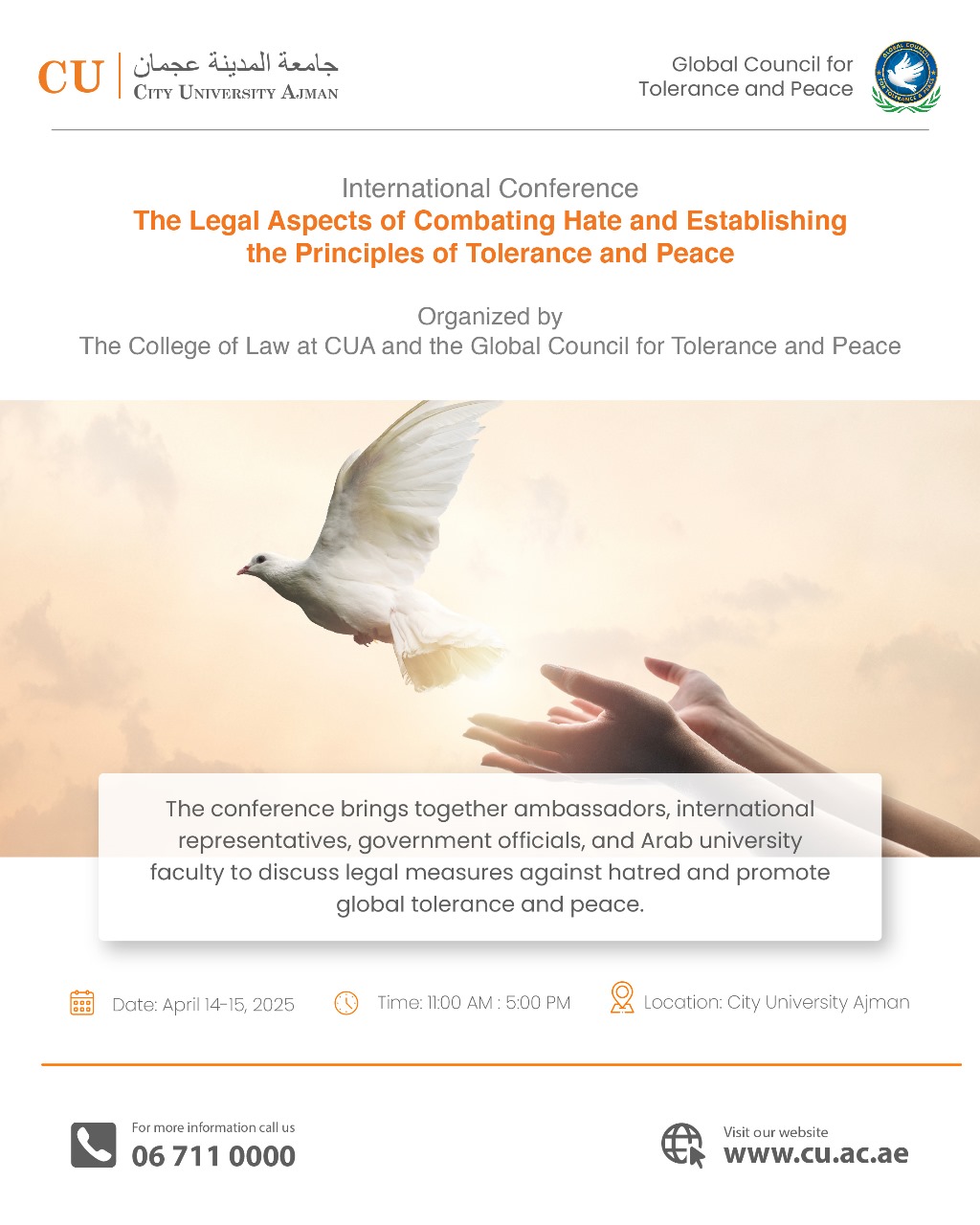 The conference brings together ambassadors, international representatives, government officials, and Arab university faculty to discuss legal measures against hatred and promote global tolerance and peace. Time: 11:00 AM 5:00 PM